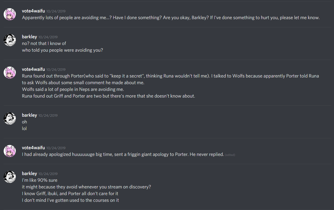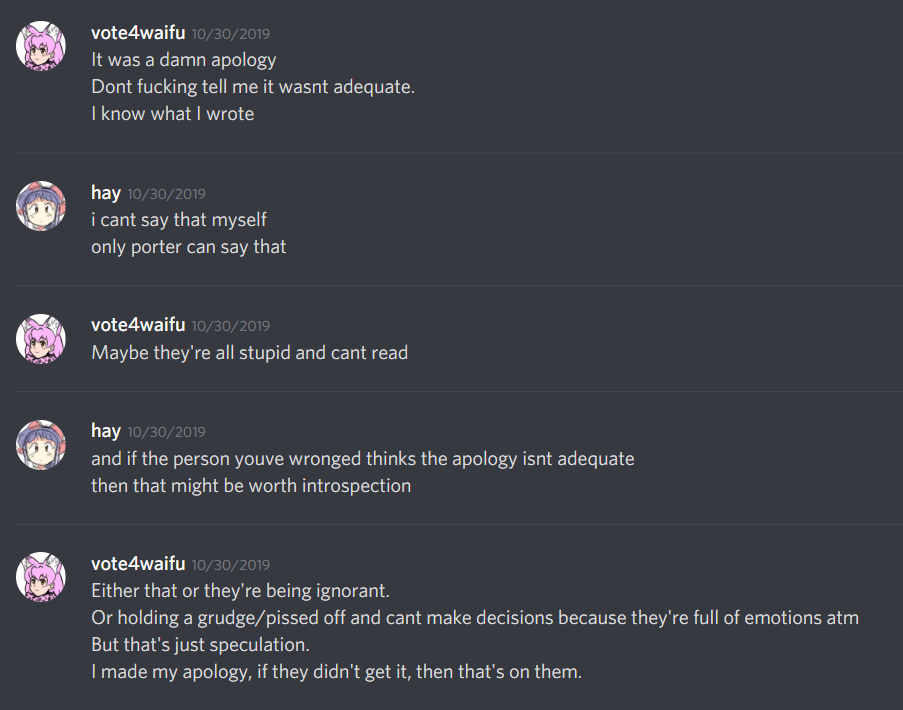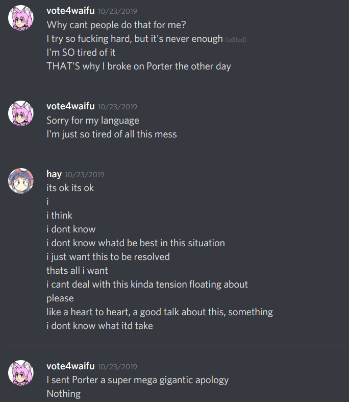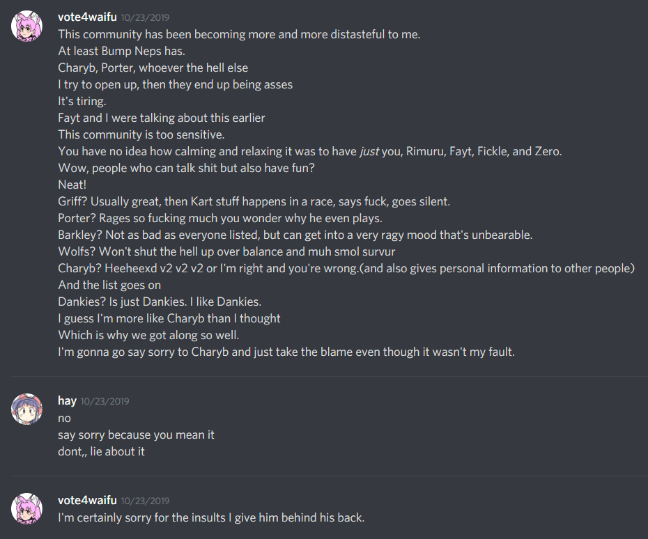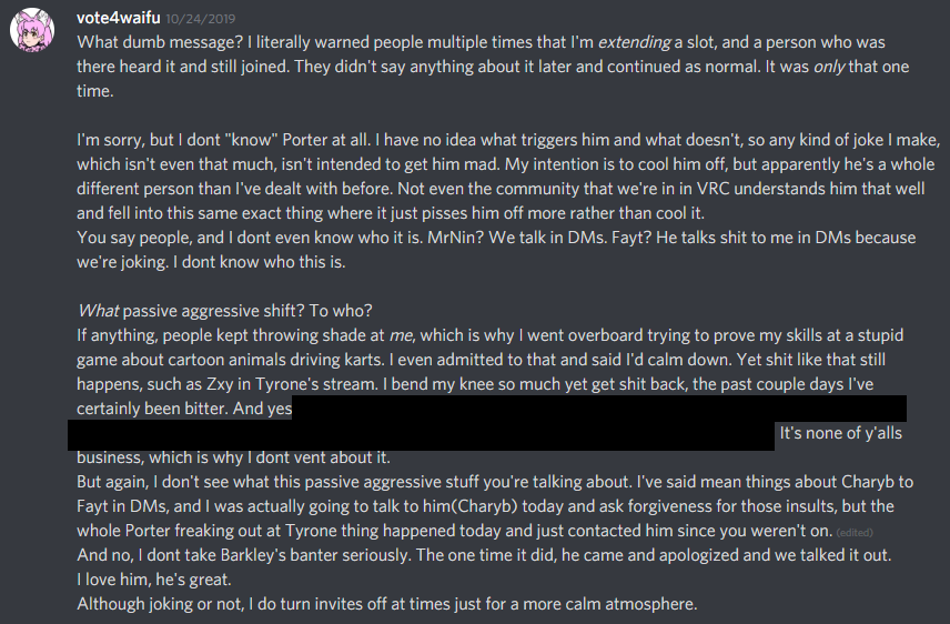 I suppose I should start with the outburst Waifu had towards Porter in a Discord voice chat. Now, Porter isn't always the best when it comes to handling his frustrations and anger, but his complaints about what Waifu does involving the Race DX family of servers is valid for the most part. During this vc session (if i remember correctly, i believe it was Griff, Porter, Runa, Ibuki, Gunla, Waifu and me in it), Porter had brought up that Waifu had been messing with the server a bit too much during the stream prior, and Waifu went absolutely off on Porter, telling him he's a loser with no life, no job, no future, ect. This was obviously uncalled for and it took everyone extremely by surprise, myself included, and the vc sorta stagnated with no apology from either side by the time I left (moreso from Waifu obviously.) I didn't know at the time but this is probably why Waifu dm'd me asking why people were avoiding them, as I didn't put two and two together.