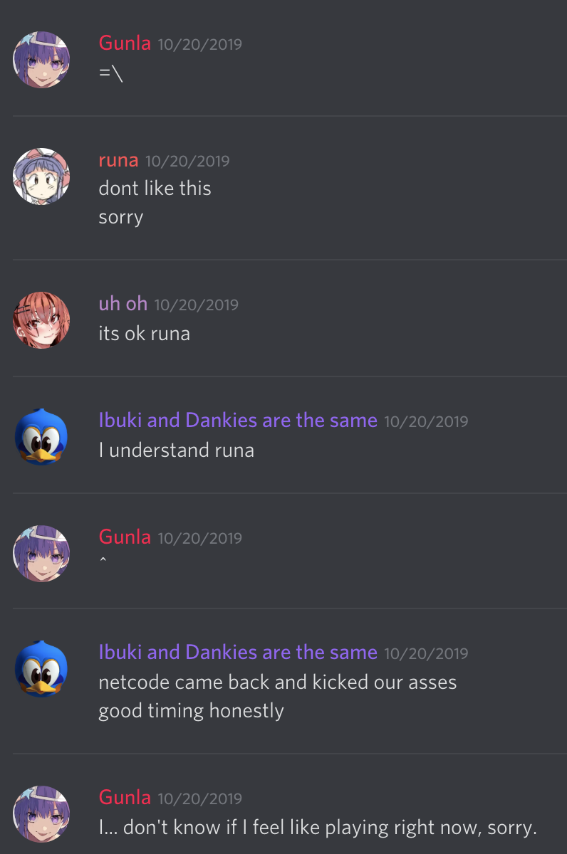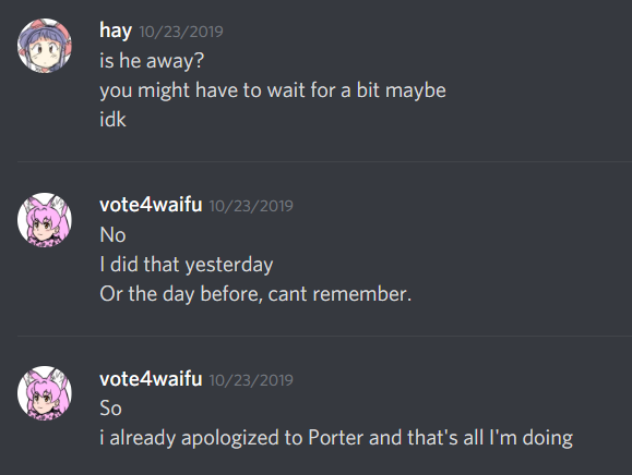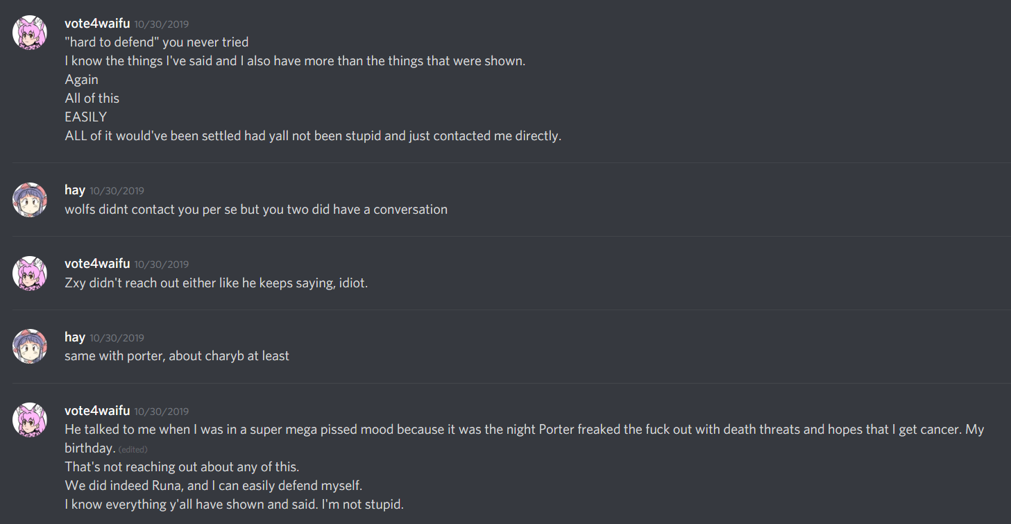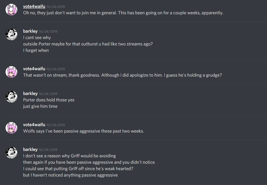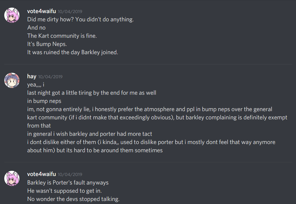 I suppose I should start with the outburst Waifu had towards Porter in a Discord voice chat. Now, Porter isn't always the best when it comes to handling his frustrations and anger, but his complaints about what Waifu does involving the Race DX family of servers is valid for the most part. During this vc session (if i remember correctly, i believe it was Griff, Porter, Runa, Ibuki, Gunla, Waifu and me in it), Porter had brought up that Waifu had been messing with the server a bit too much during the stream prior, and Waifu went absolutely off on Porter, telling him he's a loser with no life, no job, no future, ect. This was obviously uncalled for and it took everyone extremely by surprise, myself included, and the vc sorta stagnated with no apology from either side by the time I left (moreso from Waifu obviously.) I didn't know at the time but this is probably why Waifu dm'd me asking why people were avoiding them, as I didn't put two and two together.