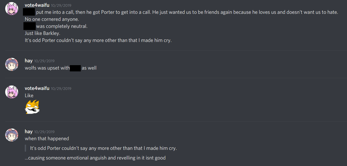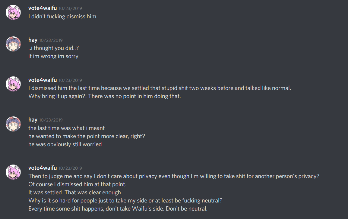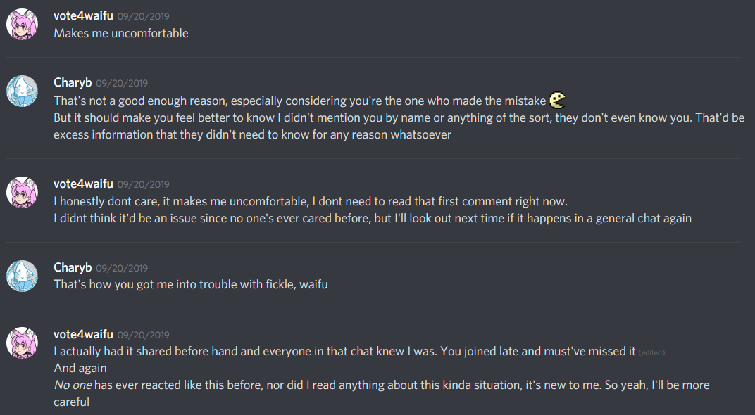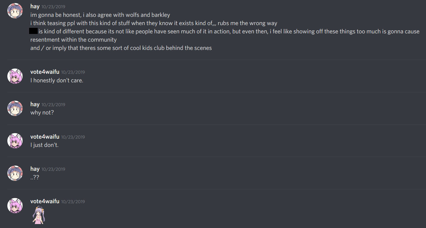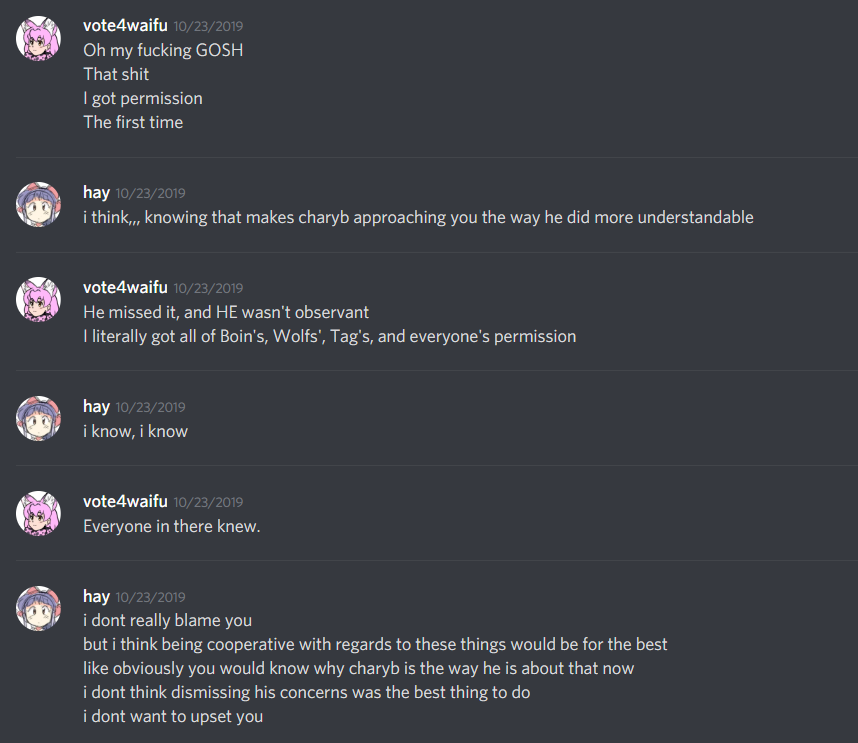 On top of what Wolfy told me, seeing this behavior in particular from Waifu really rubbed me the wrong way, so I decided to confront them about it.
