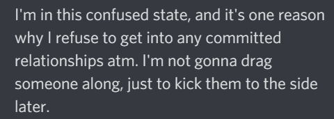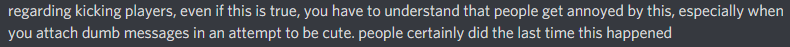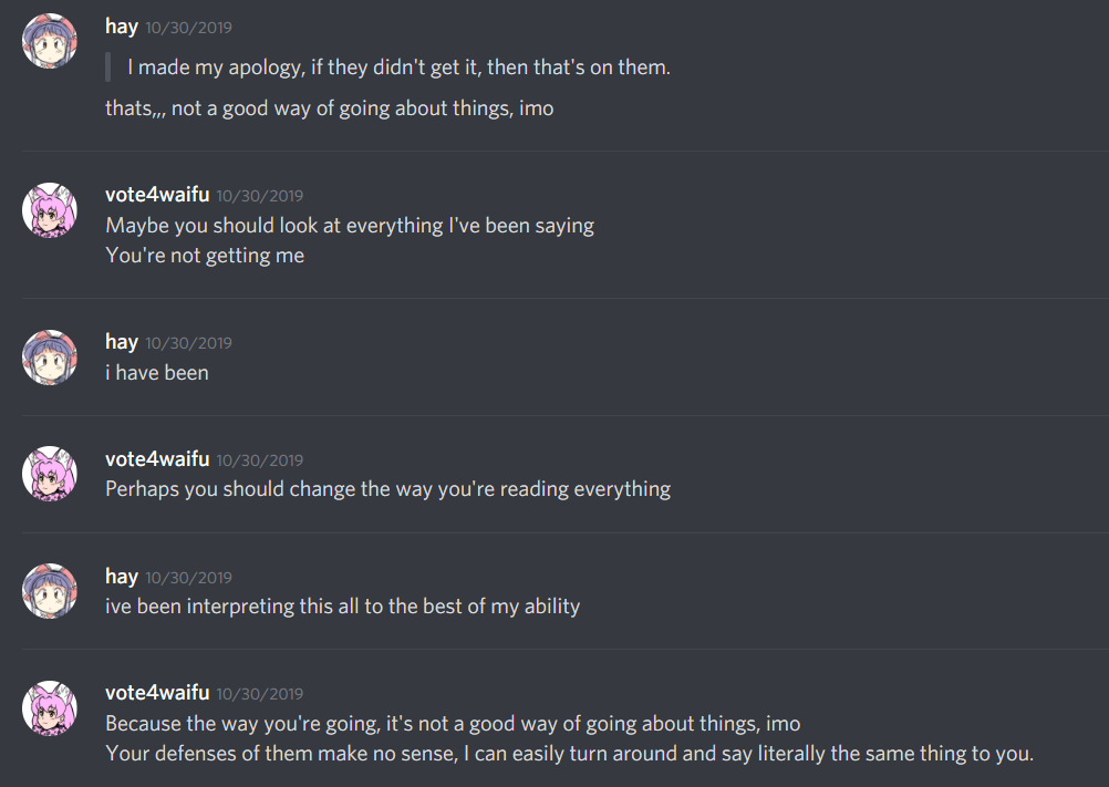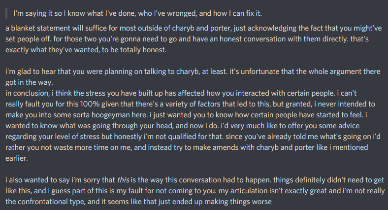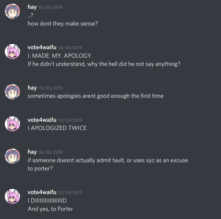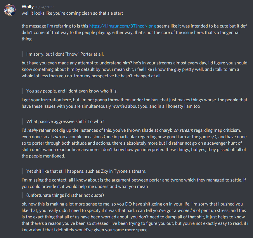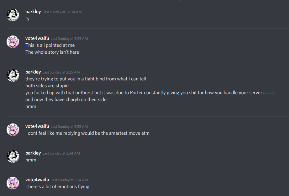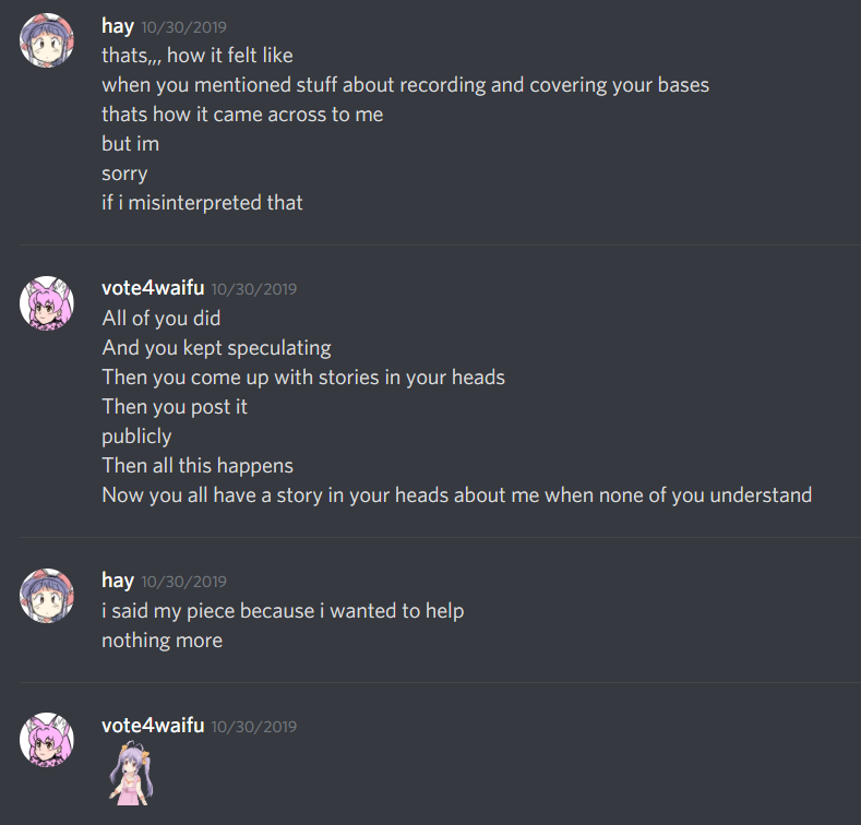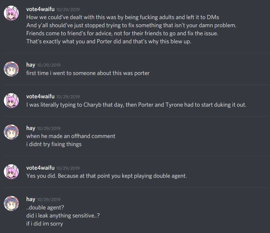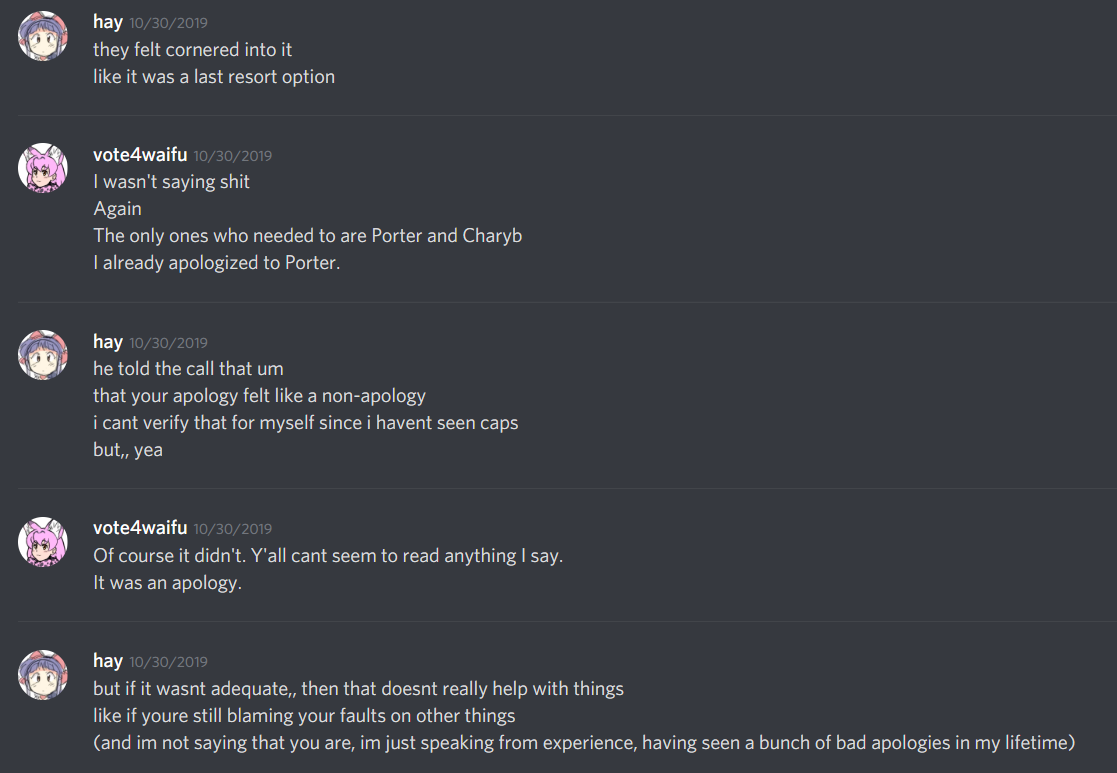 I was completely blown aback as they were bringing up stuff that I had never even heard about and all I had known that Waifu had done wrong was that outburst towards Porter a few days back. Waifu dm'd a little bit after all of this asking what to do in this situation. I, seeing what i thought was a mob mentality from all the posts in #heavy-shit, just told Waifu to chill, be rational, and wait till they cooled down as i thought responding during this would just lead to people making judgements based on emotions and not logical conclusions.