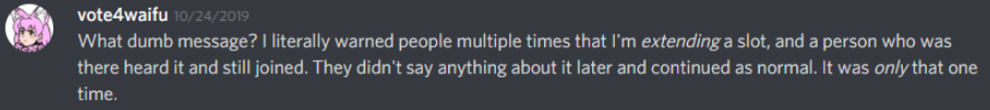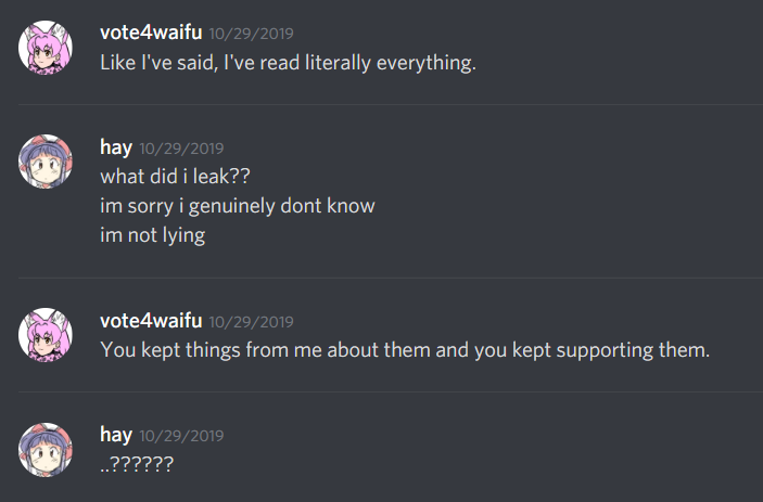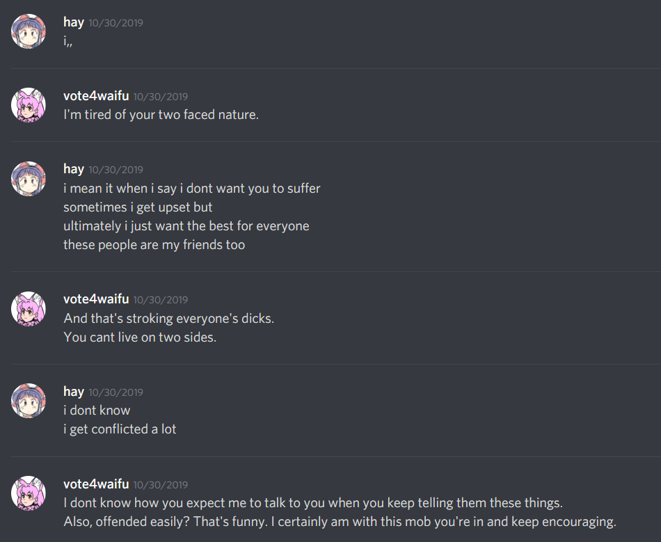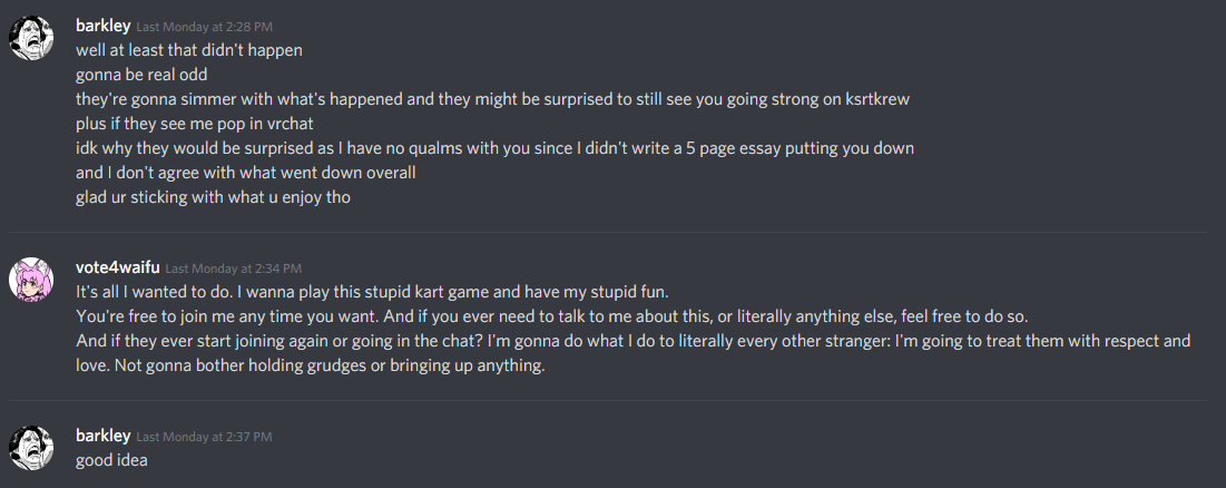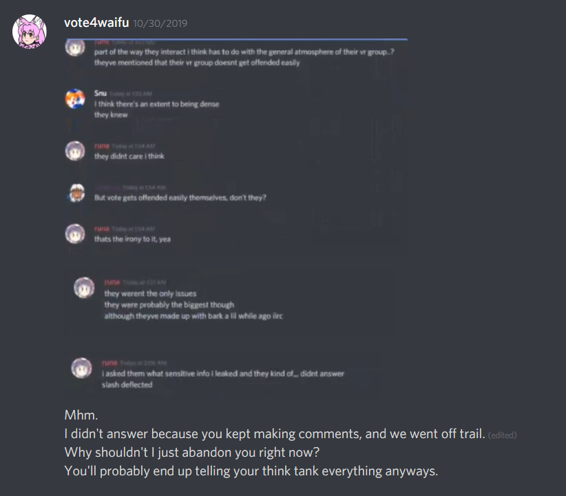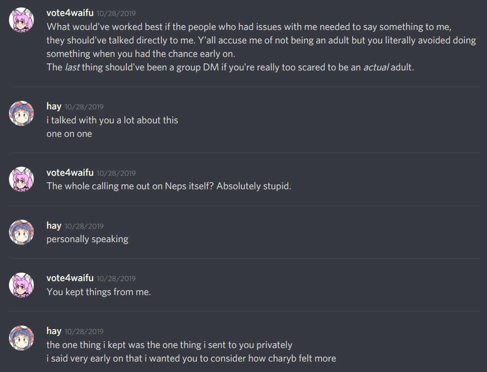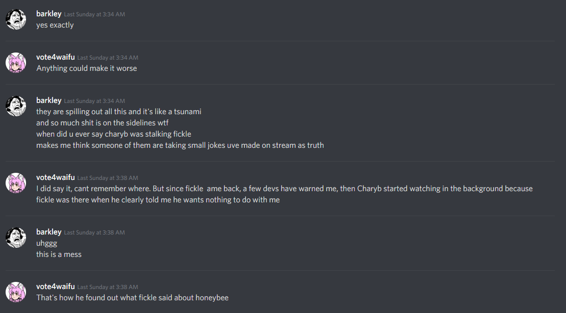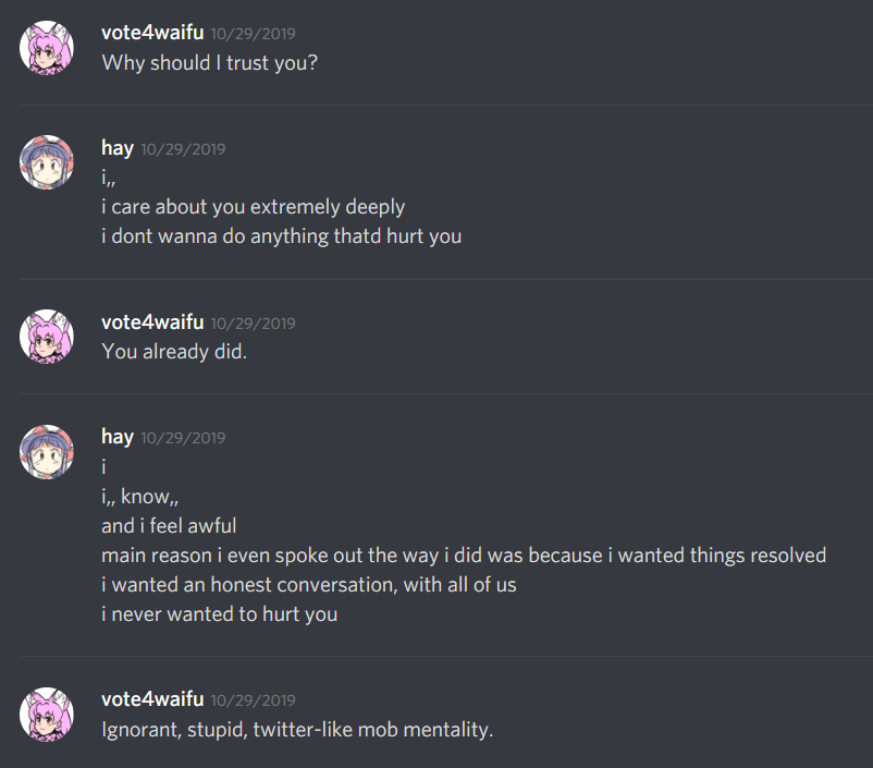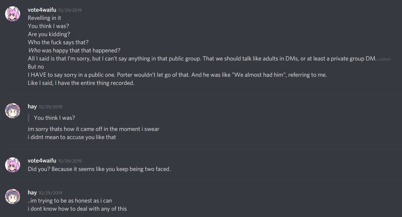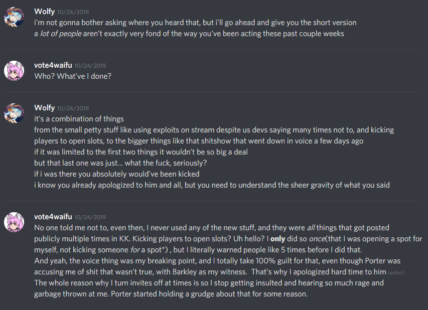 At the time, I truly felt like Waifu was being falsely accused and everyone was way over the line, completely overreacting. That is, until I joined a vc later that had everyone involved, including a few devs. In this vc, everyone poured out their side of the story with actual dms to back their sides up. What I saw in these dms was a complete 180 on the story Waifu gave me.