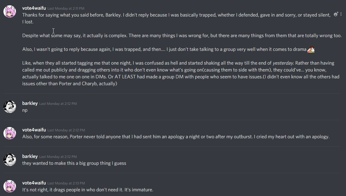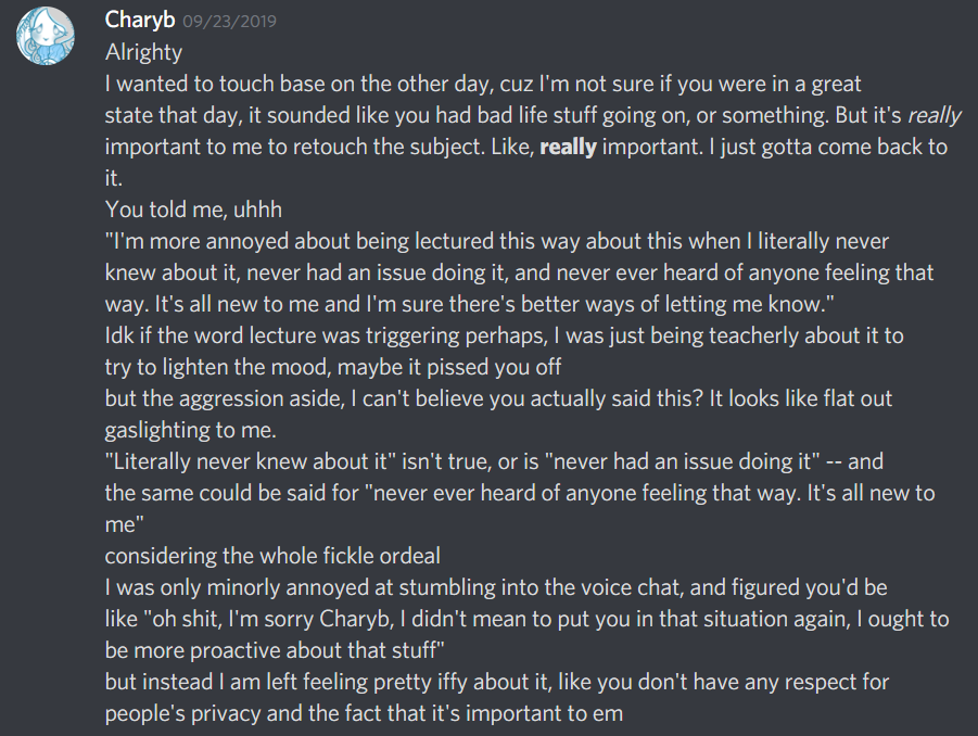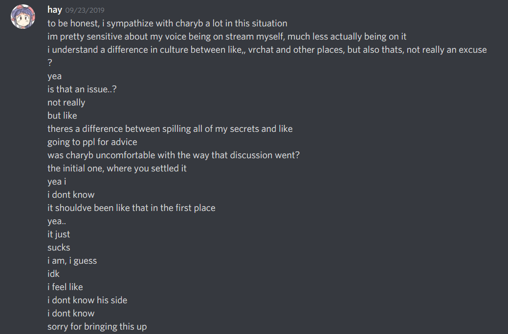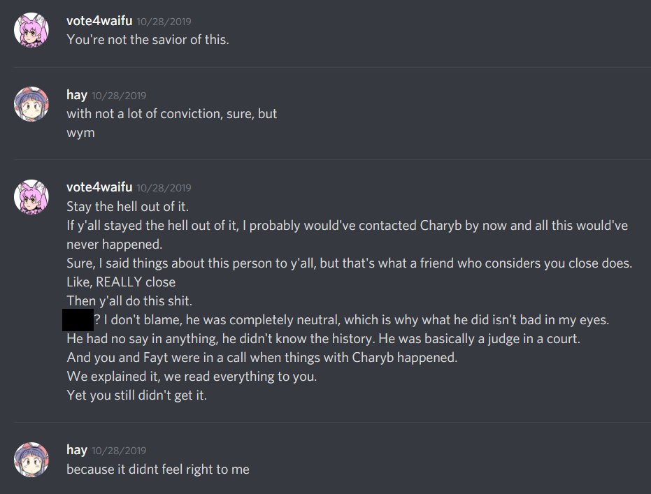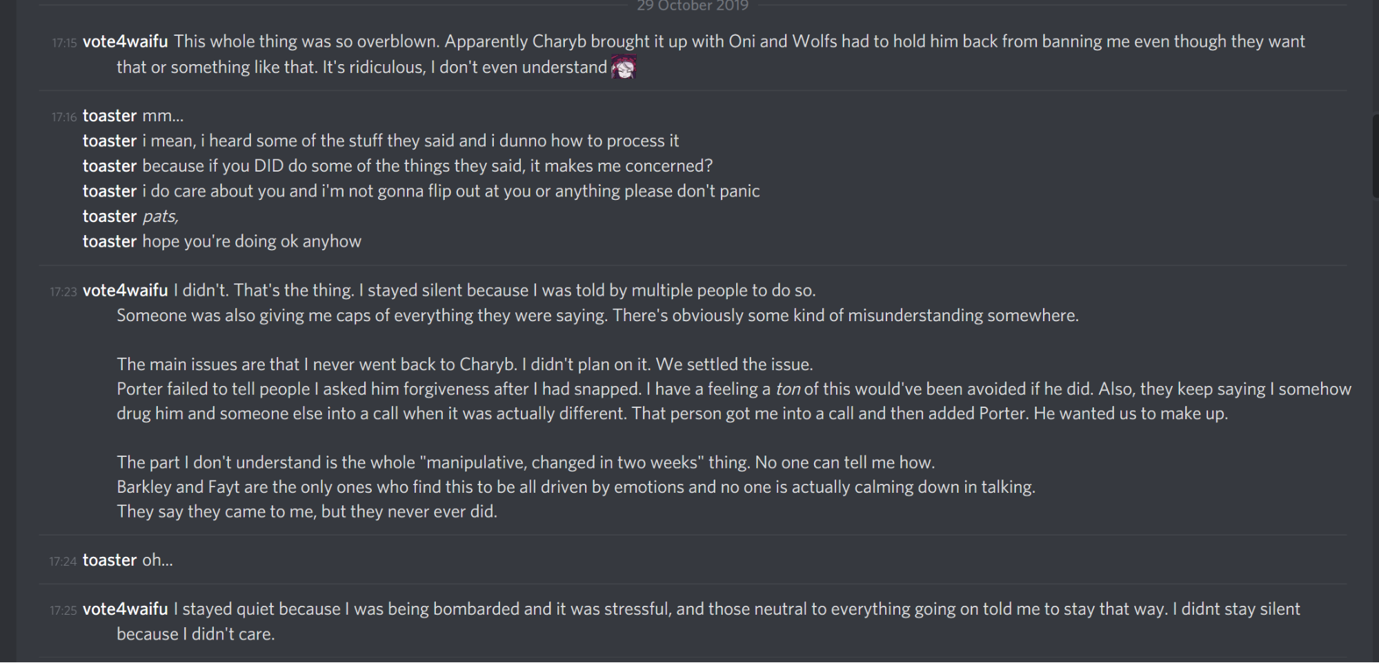 With regards to the Charyb situation specifically, I had first heard about this in a group call with Vote and Fayt. Distinctly feeling that what Vote had said about the conflict was... uncomfortable, I decided to mute and type out how I felt to them in text.