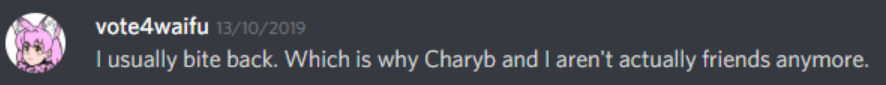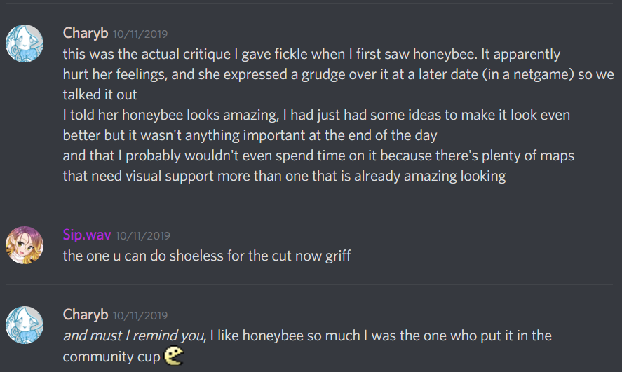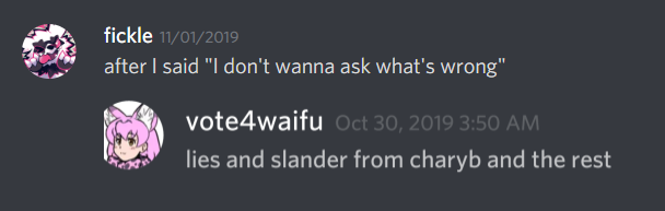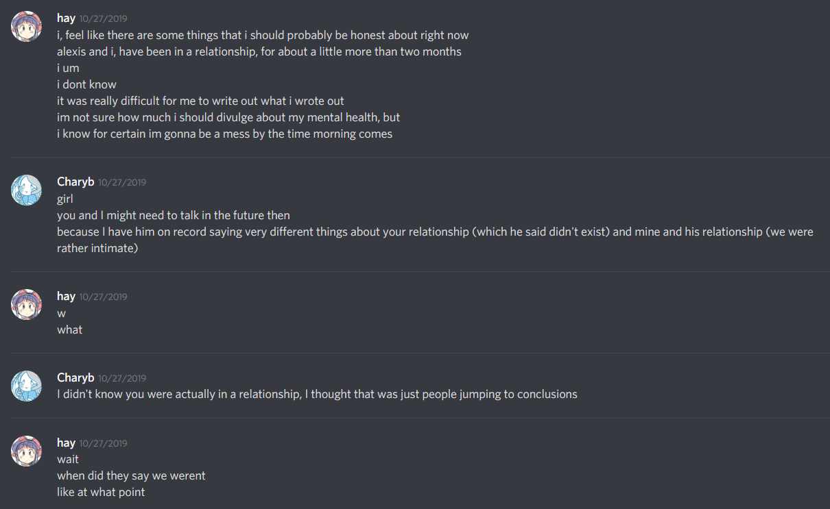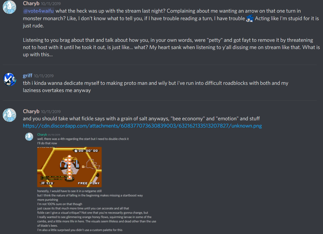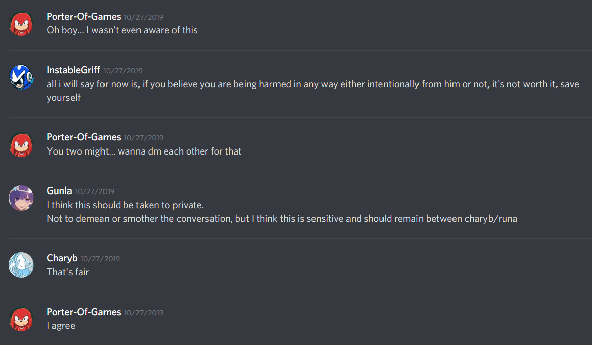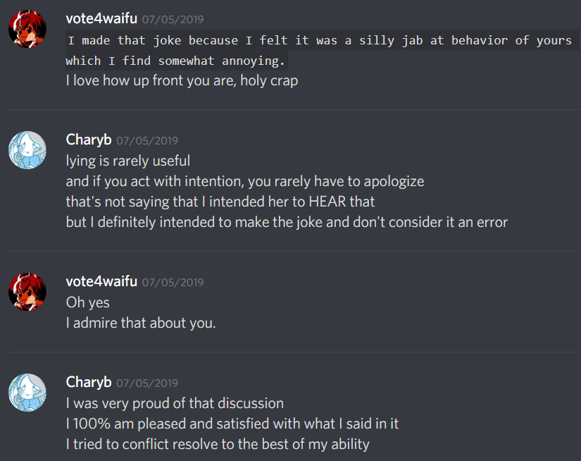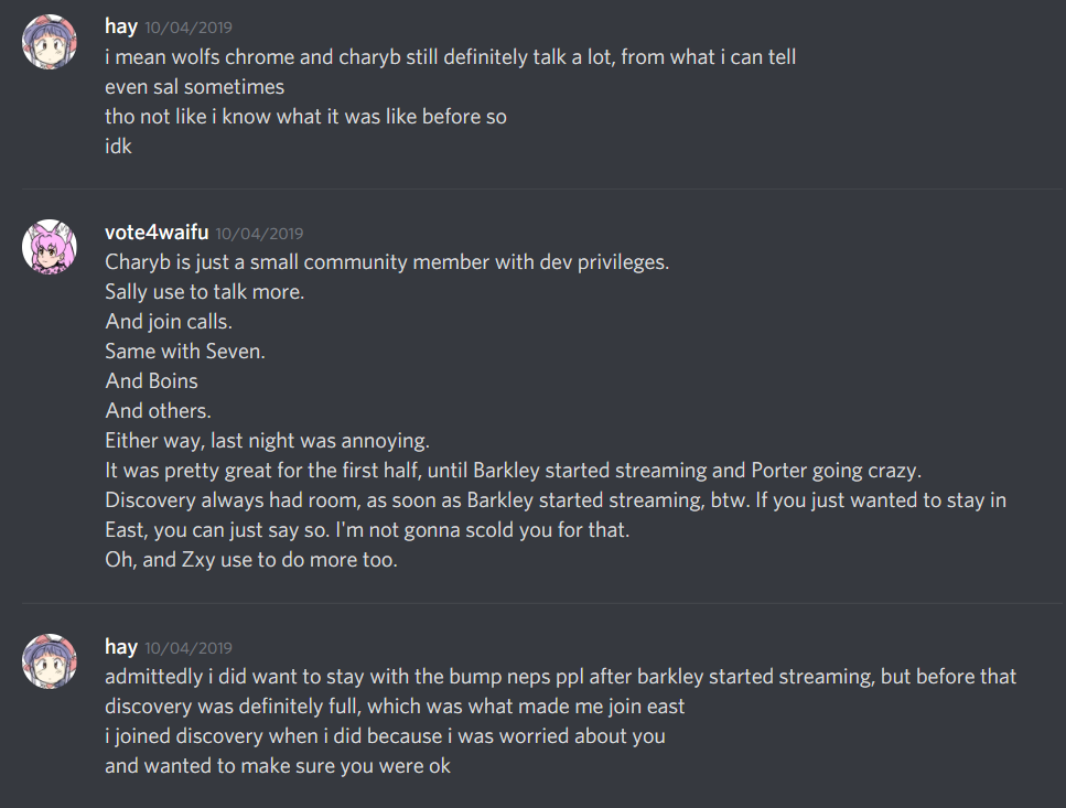 With regards to the Charyb situation specifically, I had first heard about this in a group call with Vote and Fayt. Distinctly feeling that what Vote had said about the conflict was... uncomfortable, I decided to mute and type out how I felt to them in text.