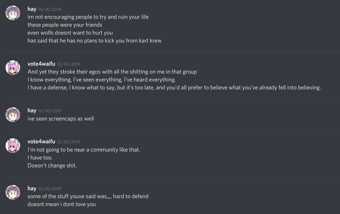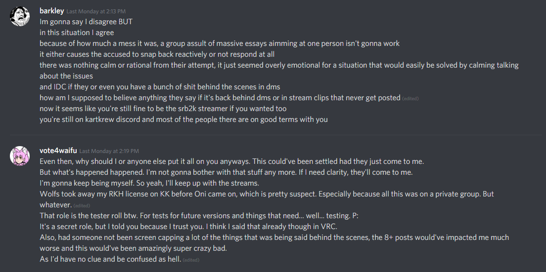 My talk with Wolfy ended up being extremely illuminating. Because up until that point, Vote had neglected to mention to me that this wasn't the first time Vote had Charyb on their stream without his permission. Nor had they mentioned that the falling out between Fickle and Kart Krew involved that. Learning what Wolfy told me made me feel a little more... miffed, about Waifu's behavior.