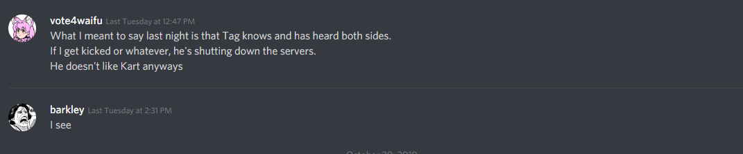I had no intention of kicking him out of the Kart Krew Discord, but I was definitely ready to if his actions persisted there. However, at the time of this writing, he had left the Discord.