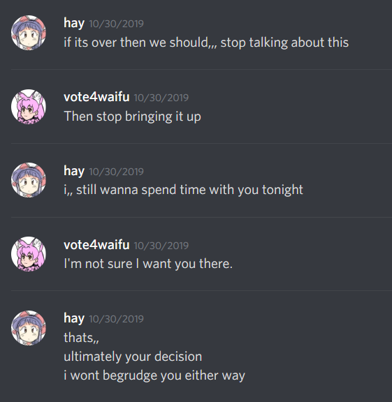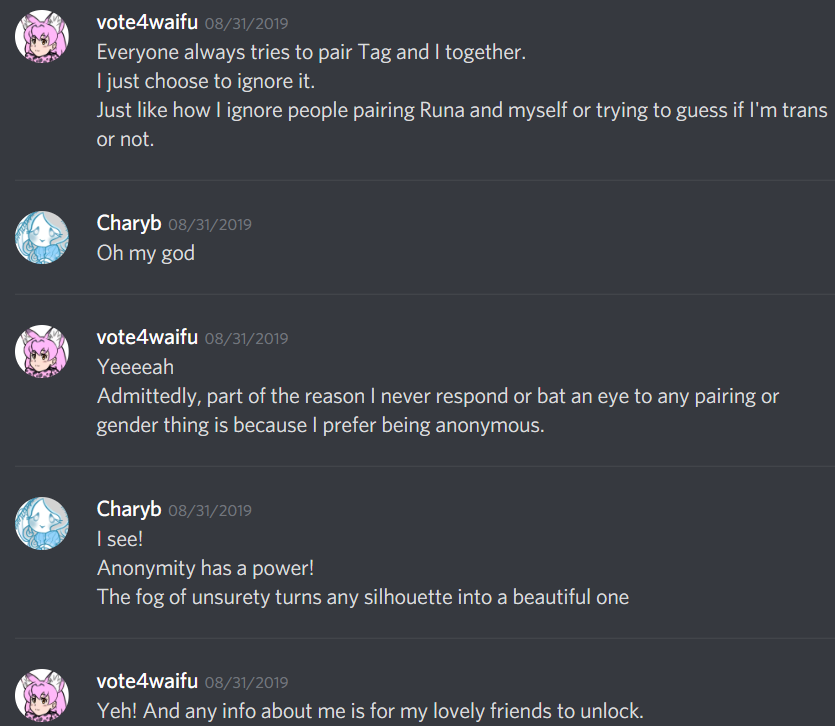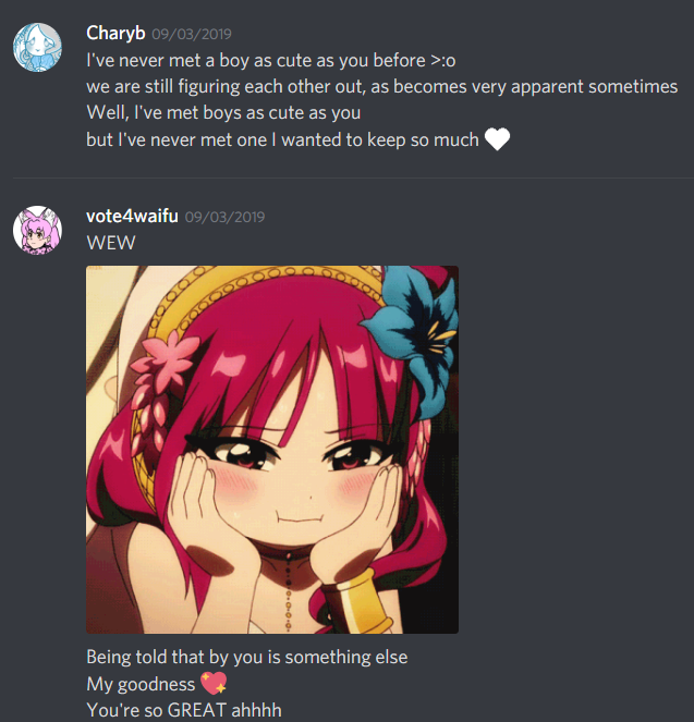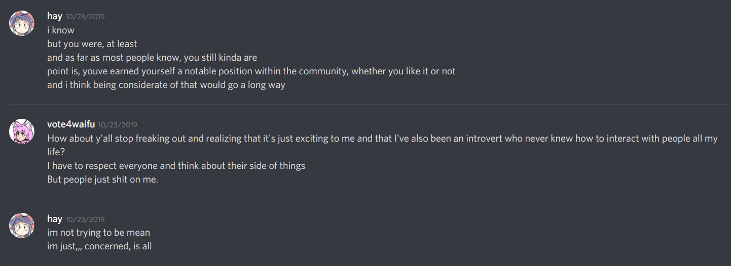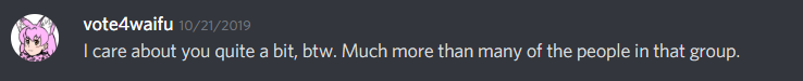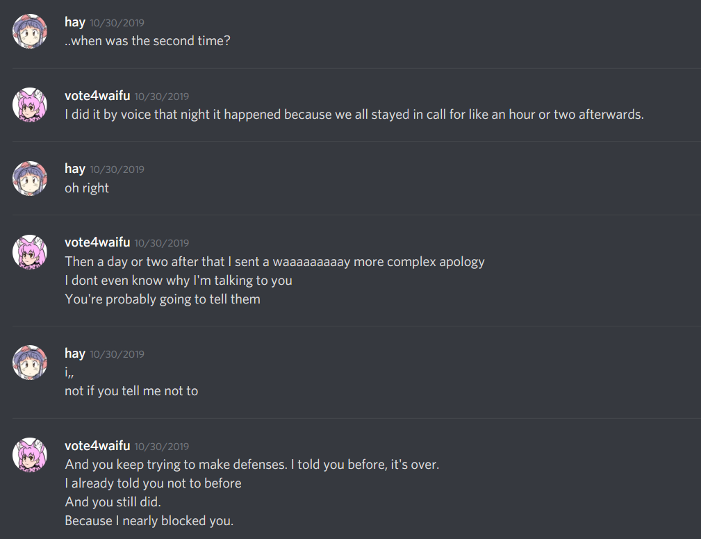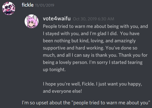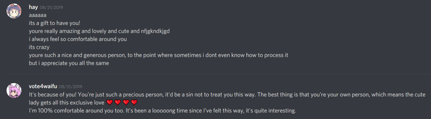This was our first significant interaction, but after it was said and done, vote4waifu ended up becoming very close -- and the extent to which we became close will be relevant later on.