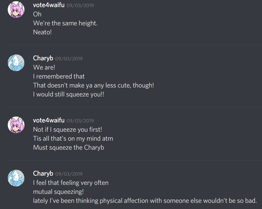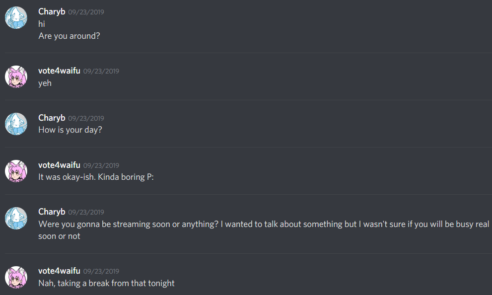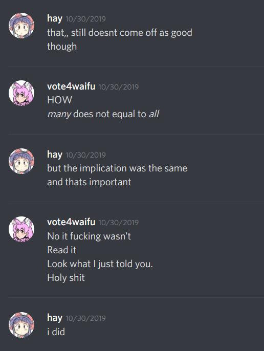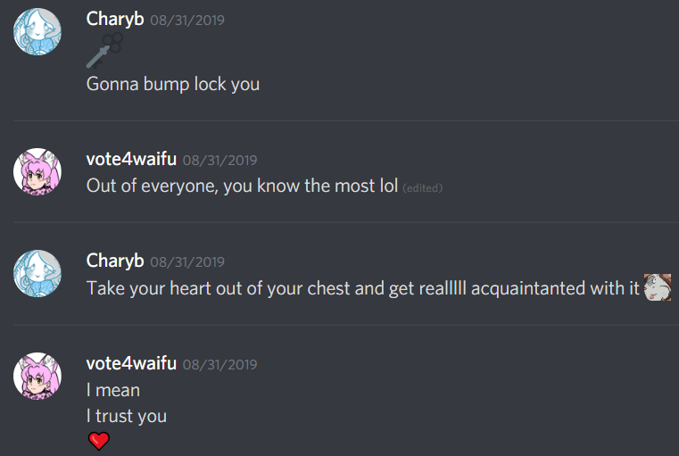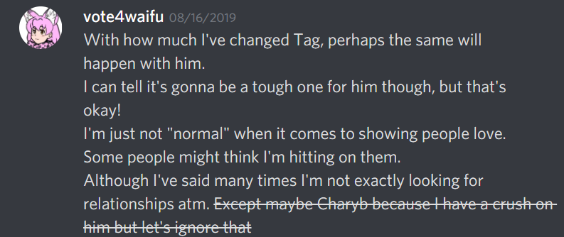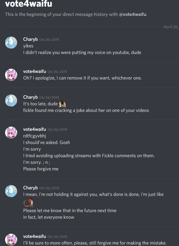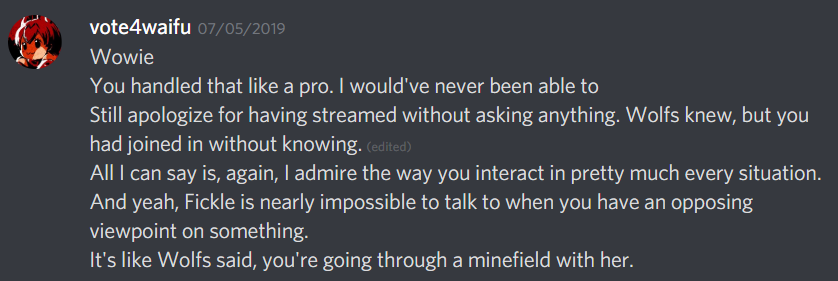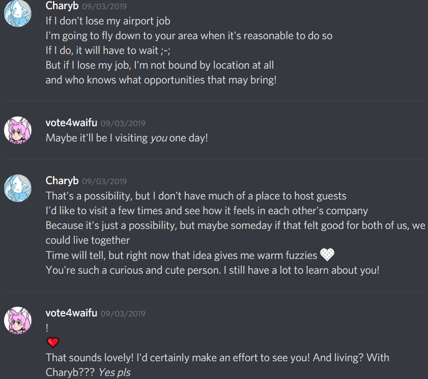 This was our first significant interaction, but after it was said and done, vote4waifu ended up becoming very close -- and the extent to which we became close will be relevant later on.