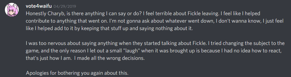 From when Charyb shared the conversation that led to Fickle leaving dev with vote4waifu.