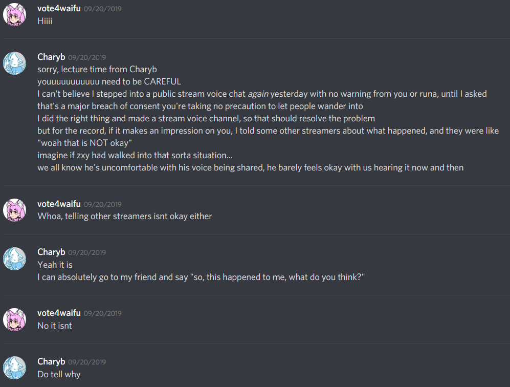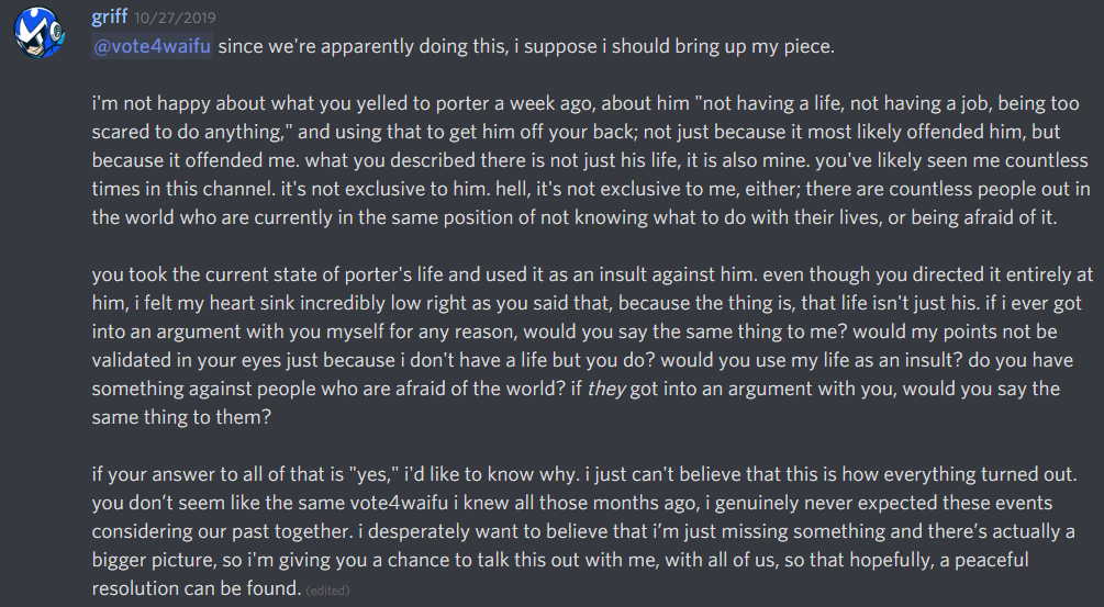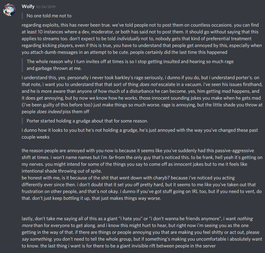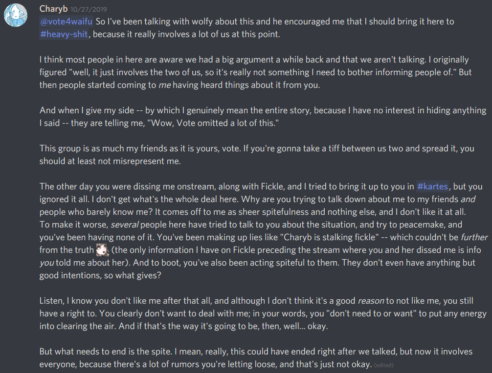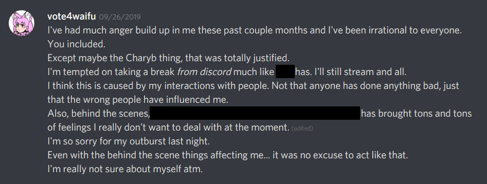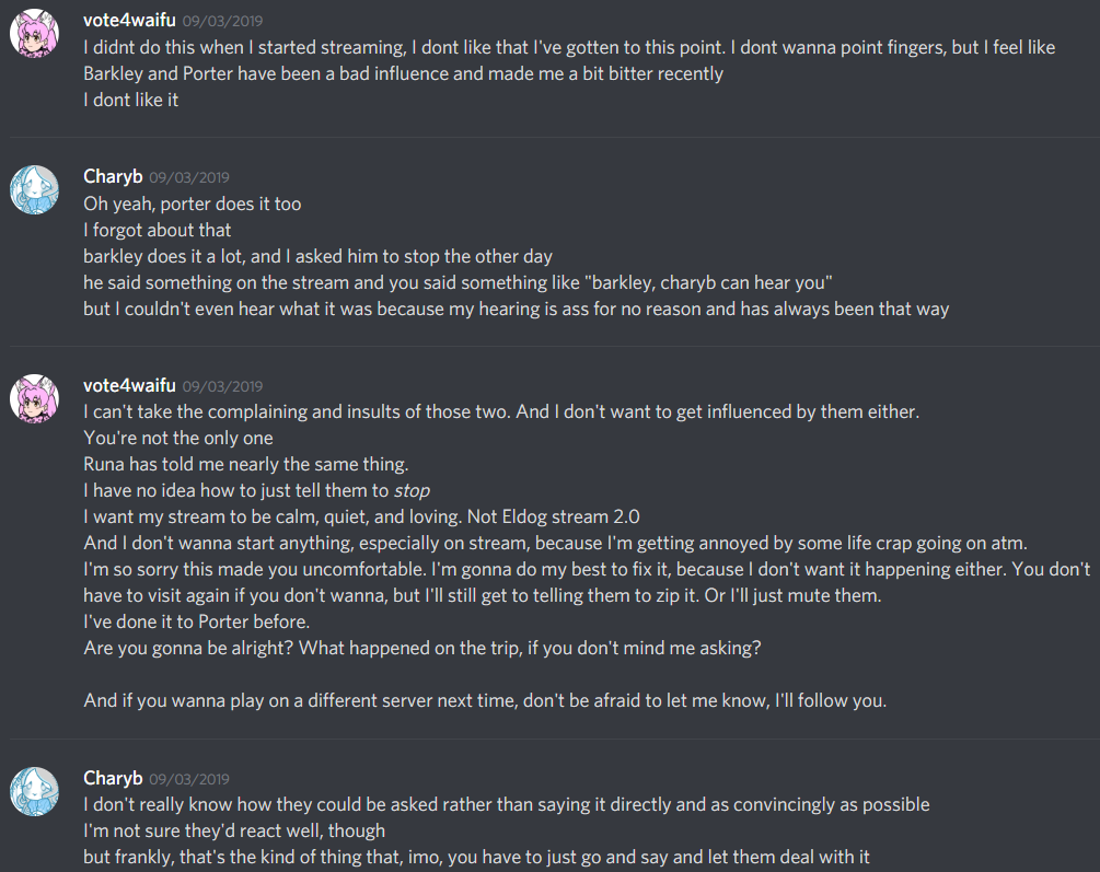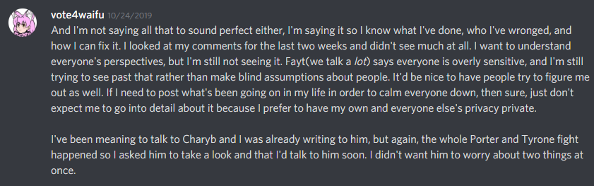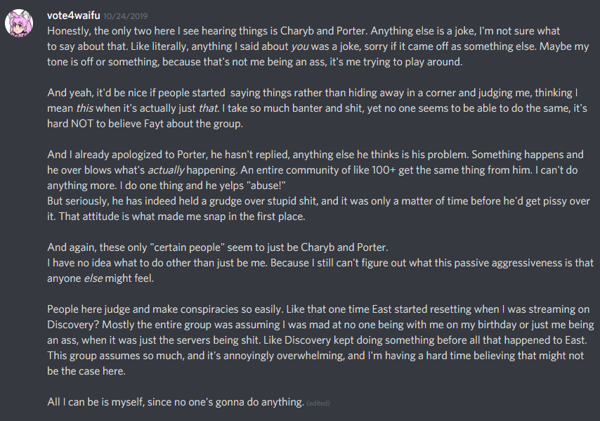 A few days later during another vc call, I noticed that the vent channel in our server had a massive post by Charyb asking Waifu what their problem is, why they keep being a dick in general to people in the group, and basically asking for a big apology. Then, over the course of a few hours Runa, Porter, Griff, Telos, Ibuki, Wolfs, etc, all had big posts basically saying the same thing.