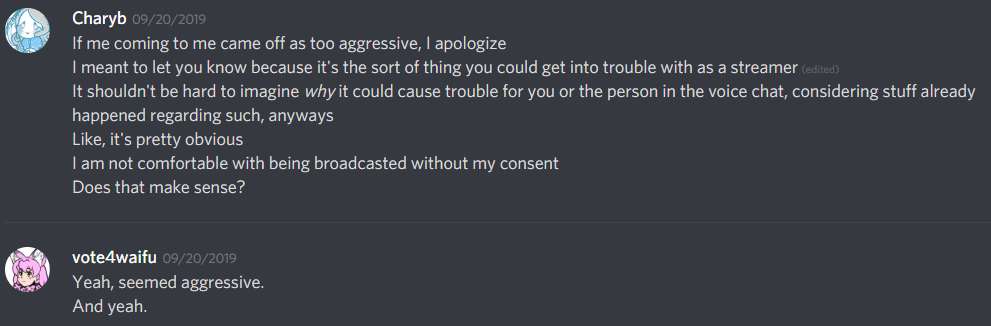 My position in this ordeal is very different, as I was not directly involved in any personal altercations with Vote. I was first made aware of problems involving him when he and Charyb had an argument over stream privacy, as outlined earlier in this document. Ultimately, Charyb was in the right here, but at the time I still considered Vote a good friend. I didn't wanna throw him under the bus so soon. Sure, Vote made himself sound like a total asshole, but I was willing to forgive it because sure, nobody likes being lectured, even when the lecture is totally justified. Unfortunately, this is only where the problems began.