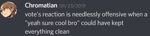 In the end, this entire exchange left me feeling very iffy. In addition to the additional deflection -- and reading this all, you should be able to see what I mean -- I felt as if I was being gaslighted. "Literally never knew about it, never had an issue doing it, and never heard of anyone feeling that way." I didn't hold it against Vote for what had happened the first time, but it was very concerning to have him try to act like such a big deal hadn't happened.
