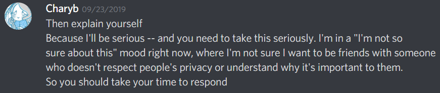 During this convo they had tried to play off Charyb's actions as if they were unreasonable and incomprehensible. I kind of.. saw through that immediately, but still wanted to give them the benefit of the doubt.