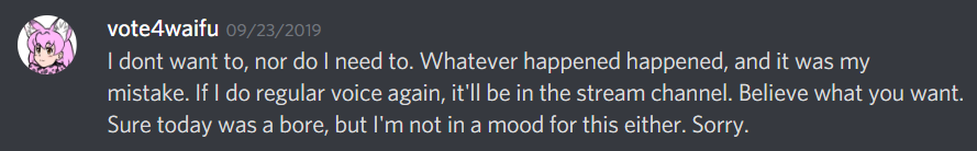 Later in the same call, Vote apologized saying "I shouldn't have said those things, I hope you can forgive me" and I just kinda went silent and said "It's whatever, man." in a very faint, defeated tone. He admitted he said those things to purposefully get under my skin, and that rubbed me the wrong way, so I was conflicted and still pissed off about it.