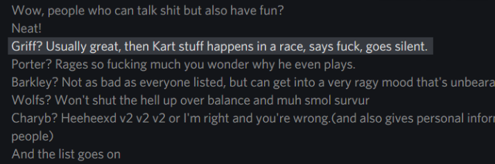 The worst part was seeing dms of Waifu shitting on people behind their backs. People like Griff and Porter just getting roasted in dms instead of just going to those said people and trying to iron out these frustrations. Hell, they even said in a dm that the group was MUCH worse off when I joined, and despite that, they went to me for advice on how to deal with everyone trying to make them stop doing all of this.