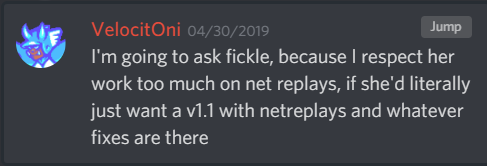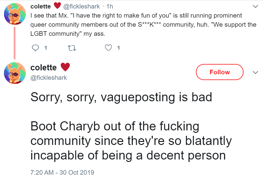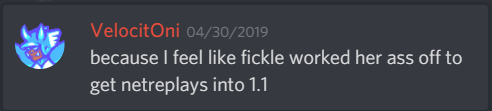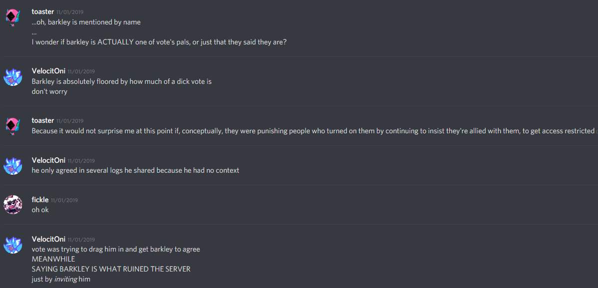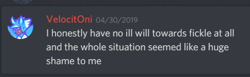 In order after we caught this post: Fickle asked D00D64 to confirm if "dev hated her", which of course turned out to be complete bullshit (though he couldn't provide many other details, as he was barely up to speed with the situation). She reached out to Wolfy, then VelocitOni as well for further clarity. Oni ended up giving her the full story, initially via Toaster as a middleman, to let her know that she was definitely being played. Charyb's involvement in Vote's departure was minor at the end of the day, and his disagreement with Vote had NOTHING to do with him being a prominent LGBT community member.