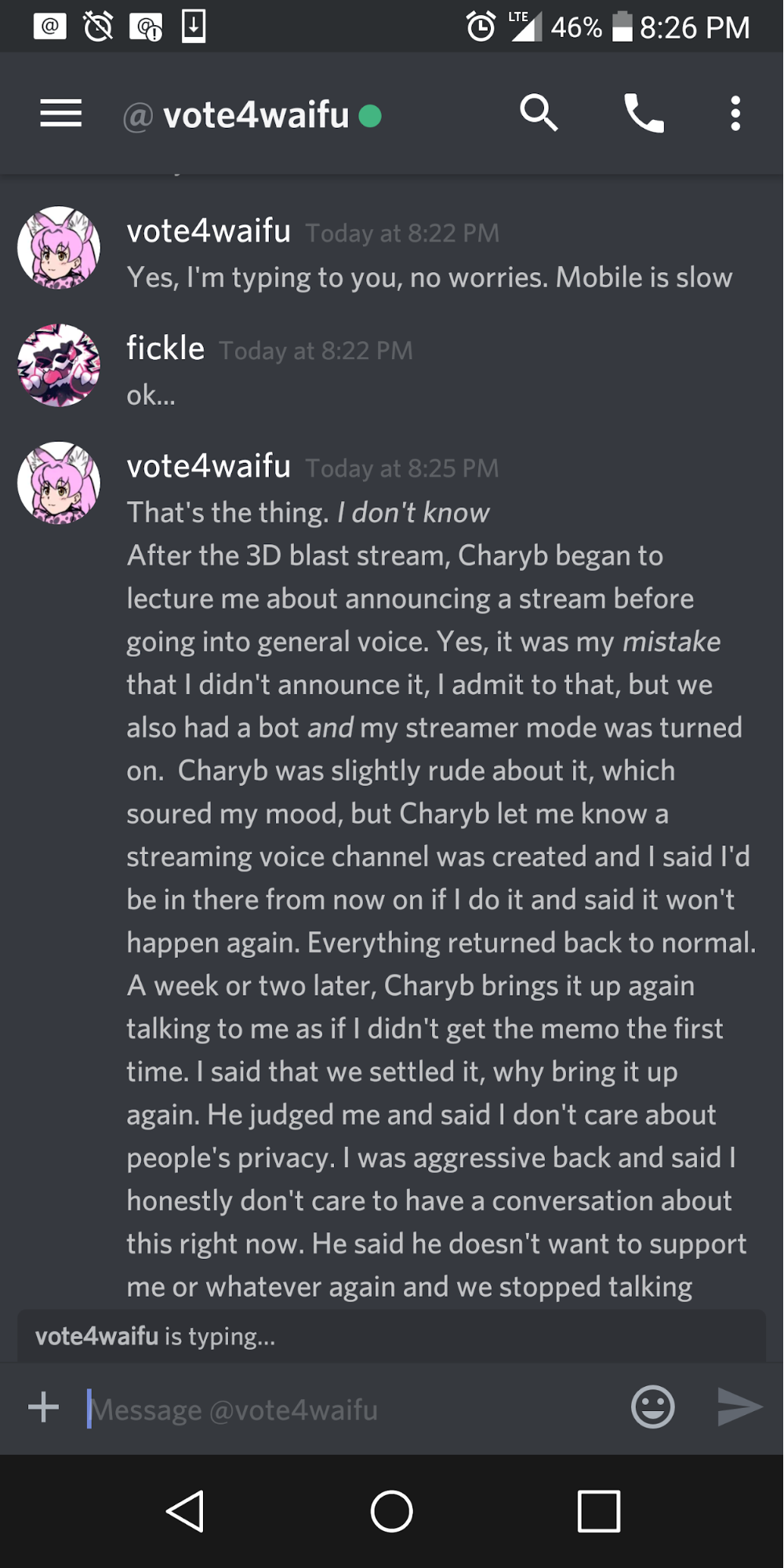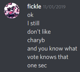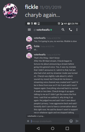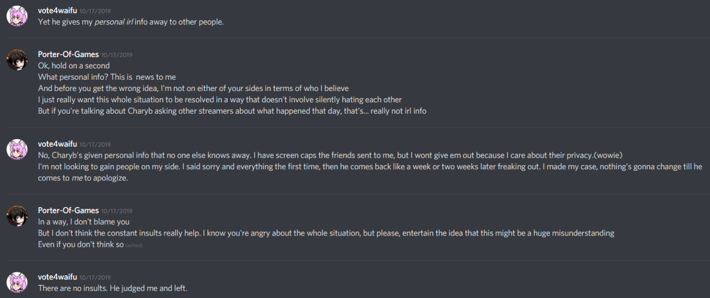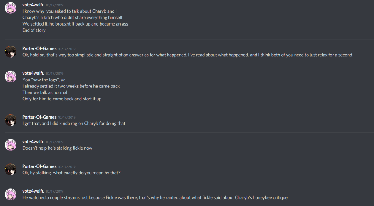 Charyb was very open to talking about the situation, would show me evidence as to what went down (including some seen earlier in this document), and opened up to me on why he felt the way he did in said situation. Vote, on the other hand, refused to tell me exactly what happened, flinging insults about Charyb, and straight up lying about what Charyb was doing, claiming "Charyb's been stalking Fickle" and that personal information was being shared. Charyb was very open to knowing what Vote meant, but all Vote would say is that Charyb watched a few streams, and that proof of personal info was withheld because of "privacy".