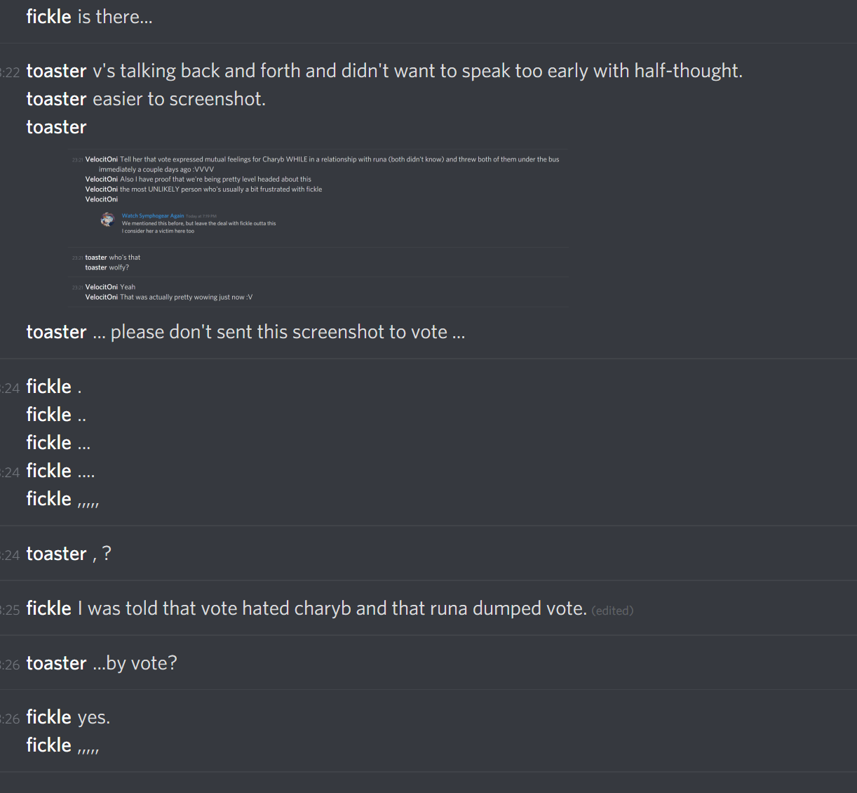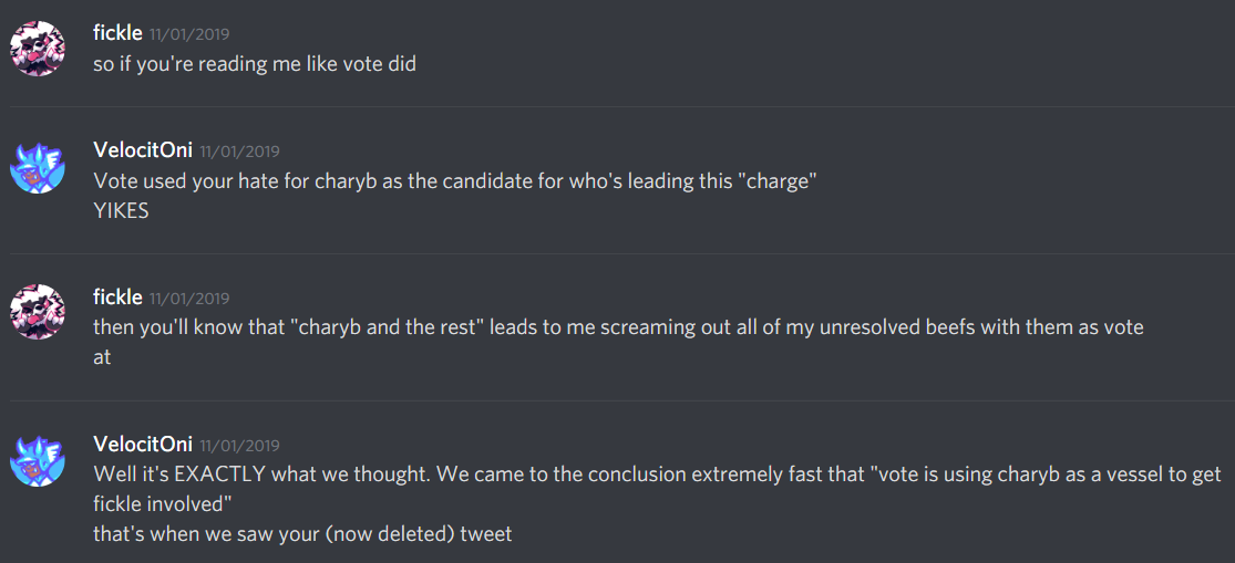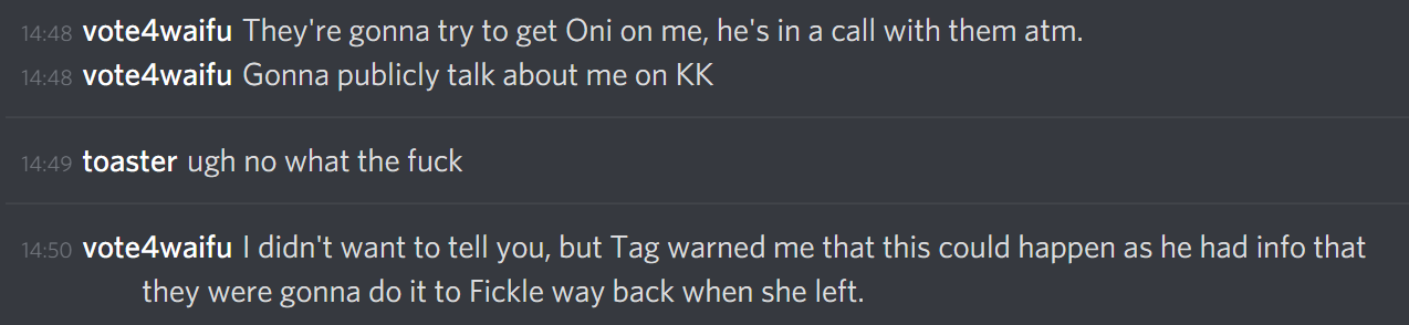 Both Vote and TAG were given some sensitive information regarding dev at the time, and they've shared this (with the timestamps cut off, no less) in an attempt to make more trouble with Fickle, as recently as a day ago as of the writing of this.