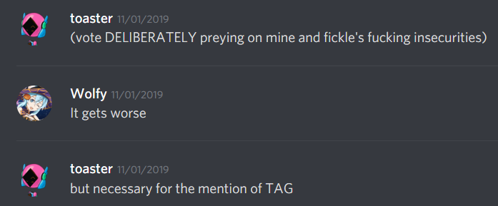 Both vote4waifu and TAG were considered friends by the group until recently. While TAG was not responsible for the same lies and manipulation that got Vote banned, his actions after the fact do not paint a good picture.