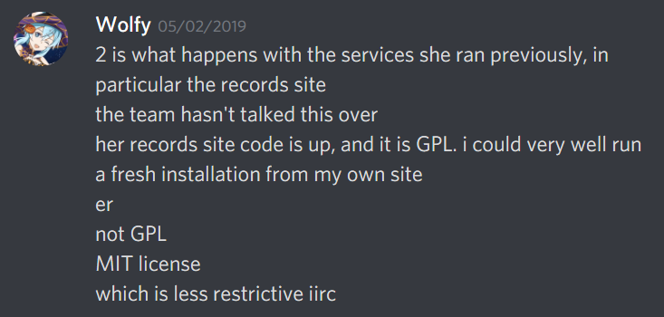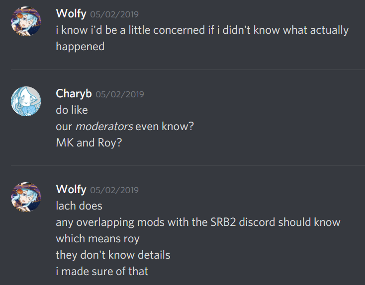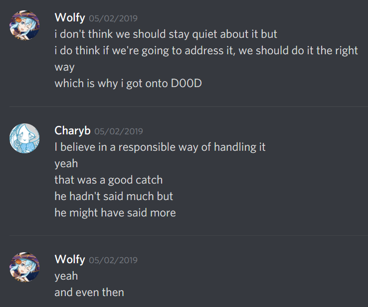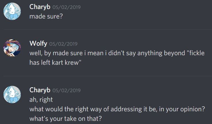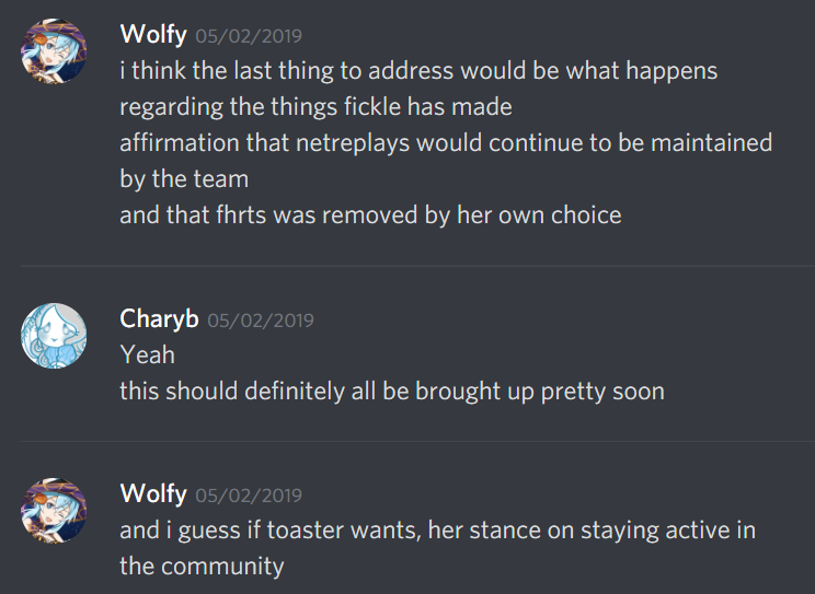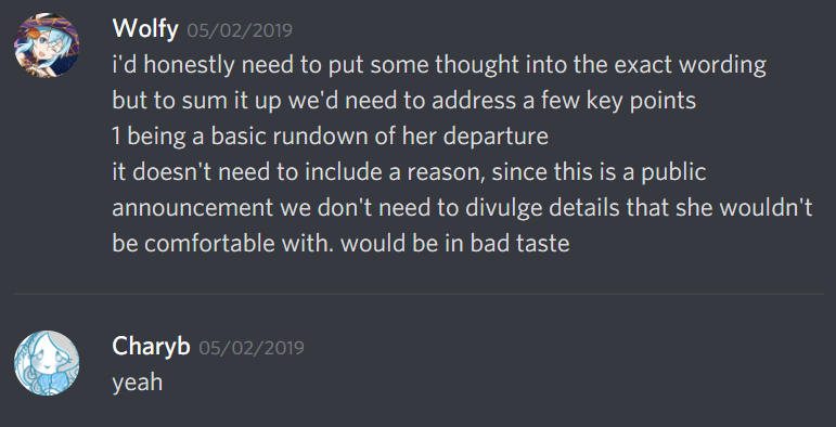 If we were to say anything at all, it would have been nothing more than a simple statement that she left the team, without going into too many details of the fuss behind it. Here's a log from May '19 of Wolfy and Charyb discussing this. It accurately reflects the sentiment we had at the time, although it should be obvious that in the end, we didn't find it necessary to do even this. Things quieted peacefully on their own.