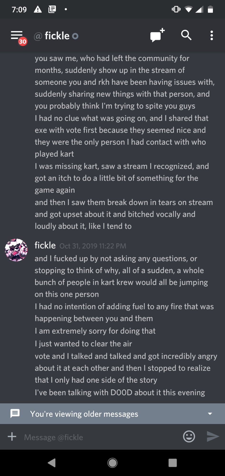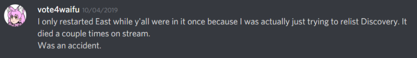 Back in April, there was a bit of a blowout in dev, because I was frustrated at one of the other devs, Fickle. I made a smartass comment about her in what I idly assumed was a private voice chat, because it was in a small server, but I was very wrong. In fact, vote4waifu was actually streaming that voice call to the Kart community at large, and I hadn't really been made aware at the time.