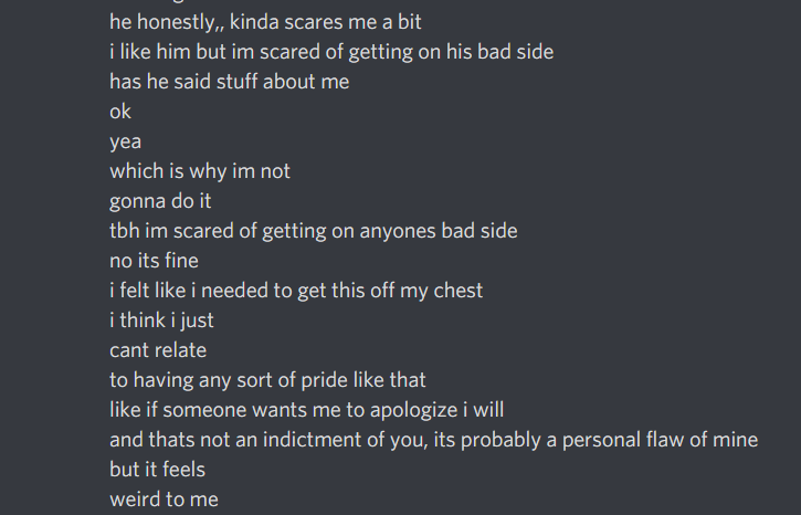 He basically admitted he lied to me as to the true intent of his actions, just for me to trust him more. Finally, he makes an off comment how he cares about me, quote "Much more than many of the people in that group" framing everyone else as not being either as trustworthy, friendly, or someone he even likes, which is still fucked up either way.