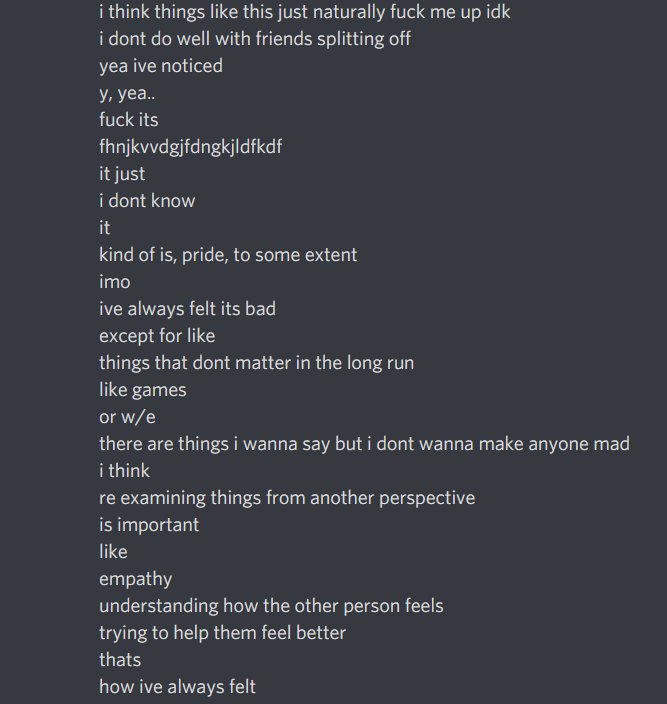 Wolfy's server has a channel that is made for more significant venting, and I happened to be a more frequent visitor. Due to this, Vote most likely already knew about my position in life prior to that insult; most of my friends do. I knew from then on that if I ever got into an argument with him myself, he would very likely say the same thing to me. If anyone else in a similar position got into an argument with him, he might say the same thing to them.