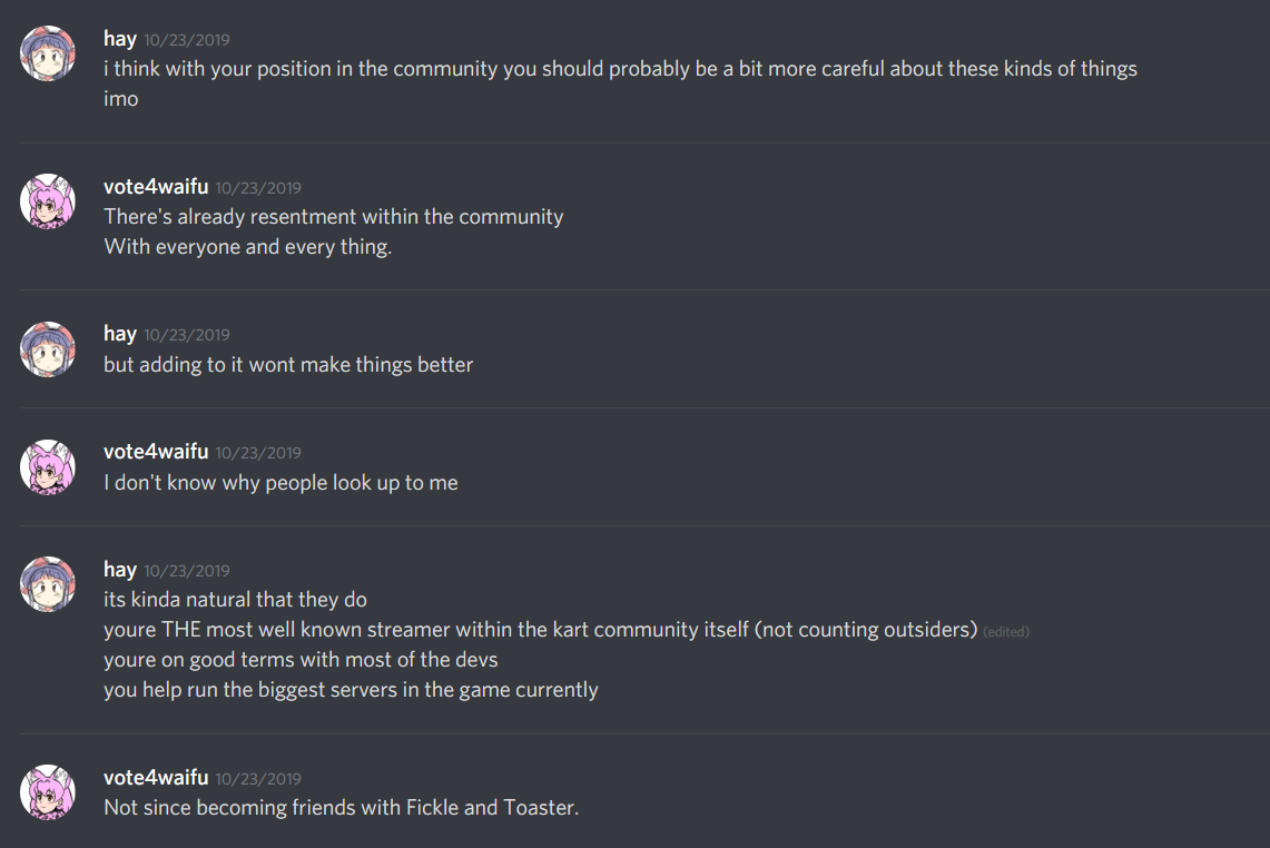 In comparison to what my friends here have dealt with, I haven't actually been in much of a rough position involving vote4waifu. He never did anything to me (directly, anyway), and I never did anything to him; we both realize that. We were seemingly on good terms for almost the entirety of his stay in the Kart community. However, one could argue that fact makes my words on this matter just as important, because I am speaking as someone that's almost never been in conflict with him for any reason. For the longest time I saw him as a genuine friend, and yet, here he was, in the last few weeks of his time with us, completely turning my expectations around and losing my trust regardless.