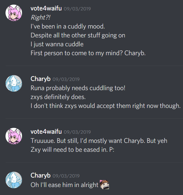 While I know that Vote is (and they've even admitted this themselves) a very flirty person by nature, the language used here ("I mostly want Charyb, I ignore people pairing Runa and myself"), and their acceptance of Charyb telling them that he wanted a relationship with them should set off multiple red flags. What Vote's intentions with this were remain a mystery to both me and Charyb to this day. Whether they were just leading Charyb on, whether they actually wanted a relationship with Charyb, whether they actually wanted a relationship with me, who was already their girlfriend by this point, I can't really say for sure. Granted, Vote and I had kept knowledge of our relationship on the downlow, but even with that, Charyb had no idea they were anything but single.