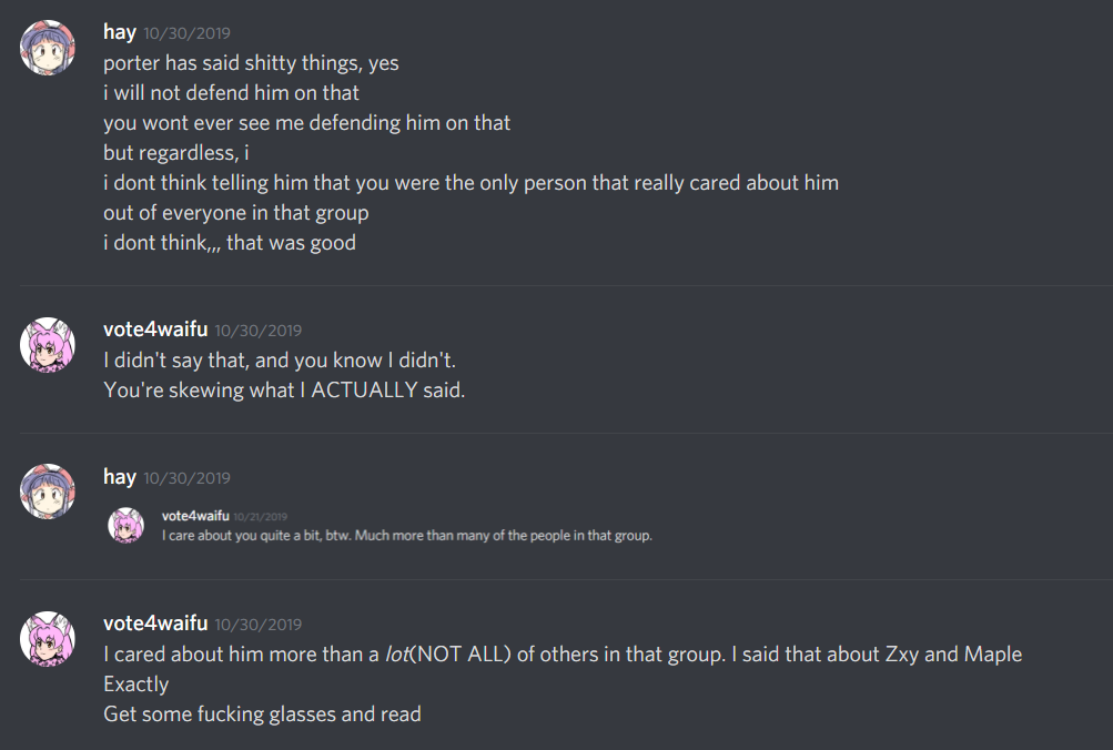 Vote ended up resorting to unnecessary insults and a disturbing attitude at the peak of his exchange to Porter. Yelling, constantly swearing, constant "fuck off"s and "grow a pair"s, letting out very strong words you would never expect him to use like "cunt"; just completely absurd behavior that I didn't anticipate at all out of vote4waifu of all people.