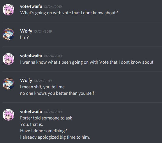 Tensions eventually rose to the point where others had started making passive jabs at Vote behind their back. Curious, and ultimately fearing the worst, I decided to message Porter, asking about what exactly was going on.