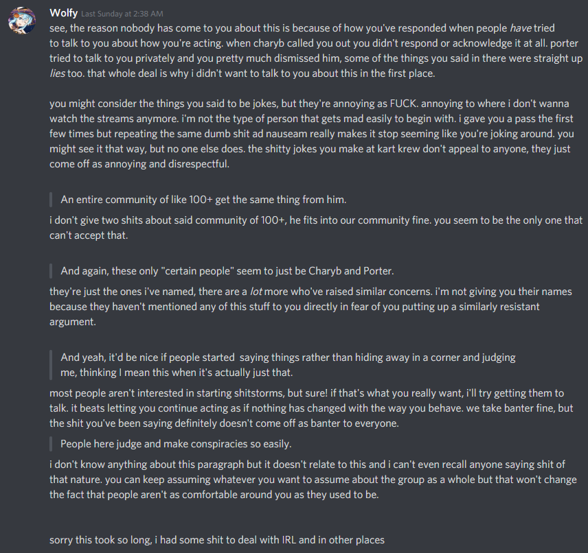 Hello, I'm Wolfy, you all are probably familiar with me from the community and Kart dev team. I'm the admin of the friend group mentioned in everyone's accounts of the situation, Bump Neps. It's a small Discord for me and my friends. All of the issues here occurred between members of this group, and as the one moderating it, it was my responsibility to make sure things were settled.