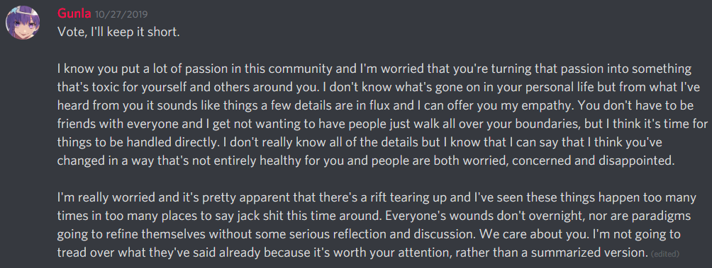 The timing of this next thing is important, because it came, chronologically, after Wolfs had spoken with Vote and we had all taken up our concerns with him. When I messaged my friend, he told me how Vote came to him crying, wanting to find some way to make amends. Out of the hope that Vote would change, I told them about the ultimatum Vote faced, and that all he had to do was apologize to EVERYONE, not JUST me.